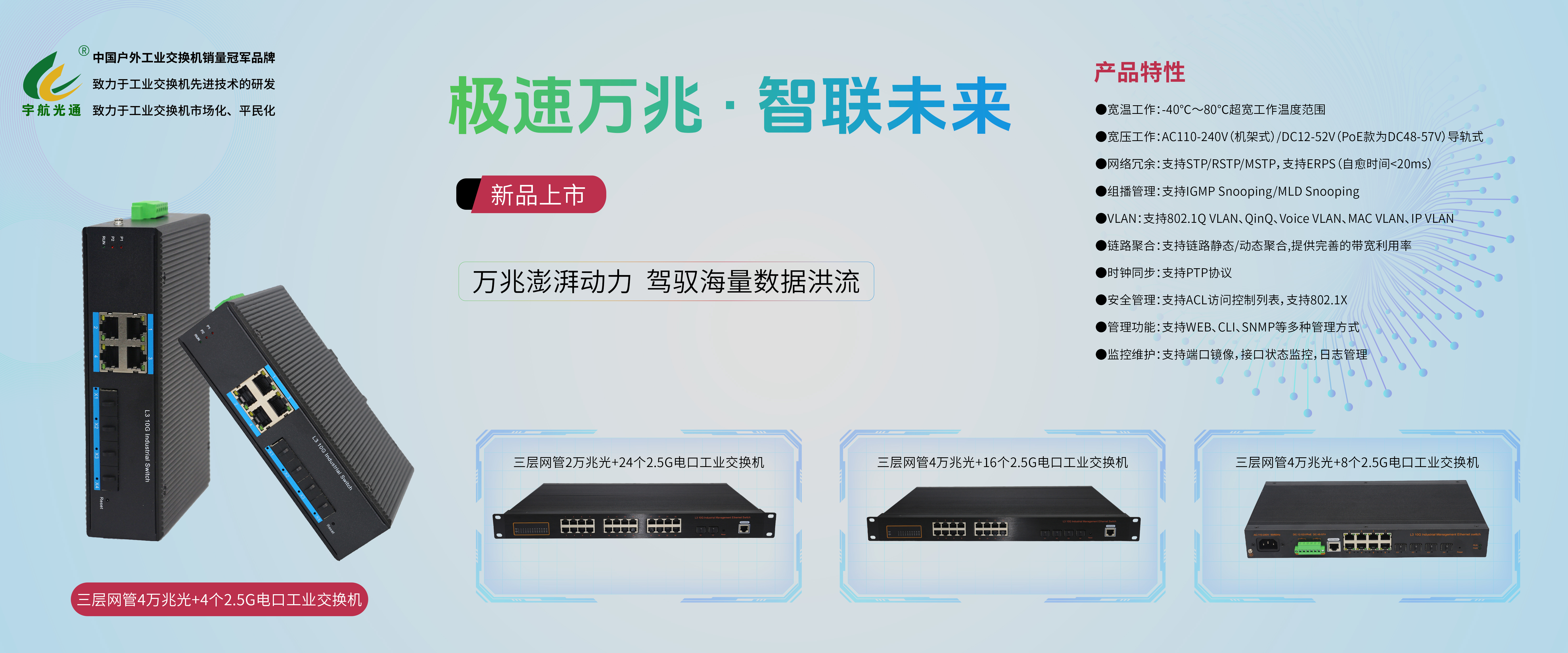 深圳市宇航光通科技有限公司總部位于深圳,是一家以工業以太網產品自主研發,生產,銷售和服務為主營業務的國家高新技術企業、深圳高新技術企業,為客戶提供高性價比的工業以太網產品和解決方案,在工業以太網產品領域獲得了多項創新型的技術成果,連續多年中國十大安防品牌,連續三年中國信創產業500強,中國信創產業獨角獸100強,中國信創產業領軍企業100強,工信部、公安部等智慧城市首推品牌,宇航光通專注于工業交換機品牌市場和中大型客戶OEM/ODM市場。產品包括工業級收發器、工業級交換機、二層工業級PoE交換機、二層非管理型工業級交換機、二層工業級管理型交換機、三層工業級萬兆交換機等。宇航光通致力于打破工業交換機西方巨頭的技術壟斷,致力于工業交換機市場化、平民化。